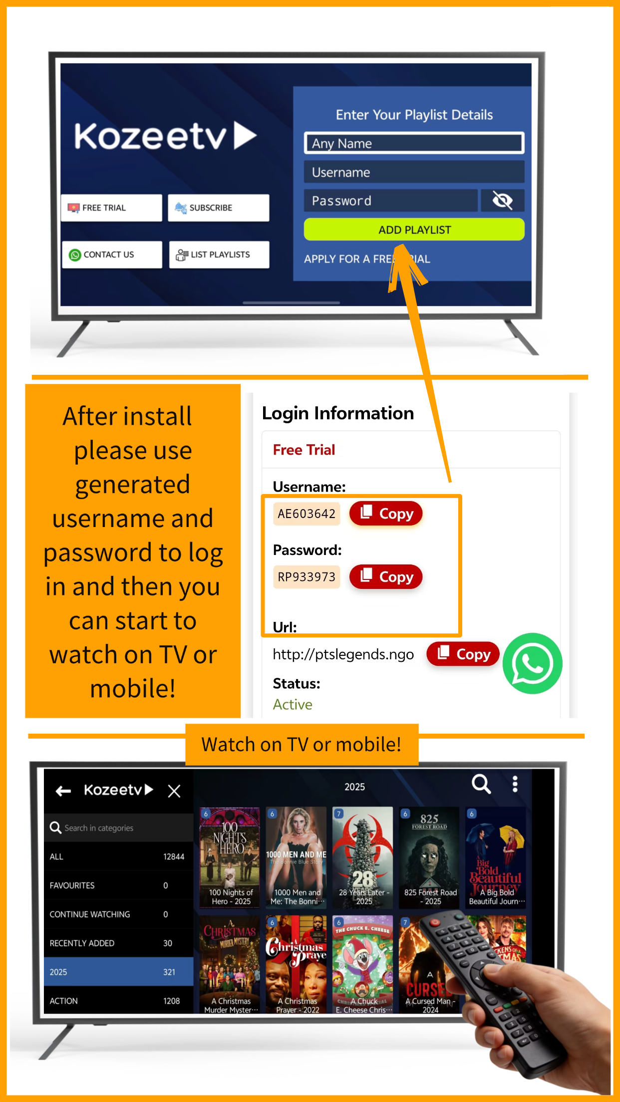8. After install, use generated login to log in the app then start watching.โ